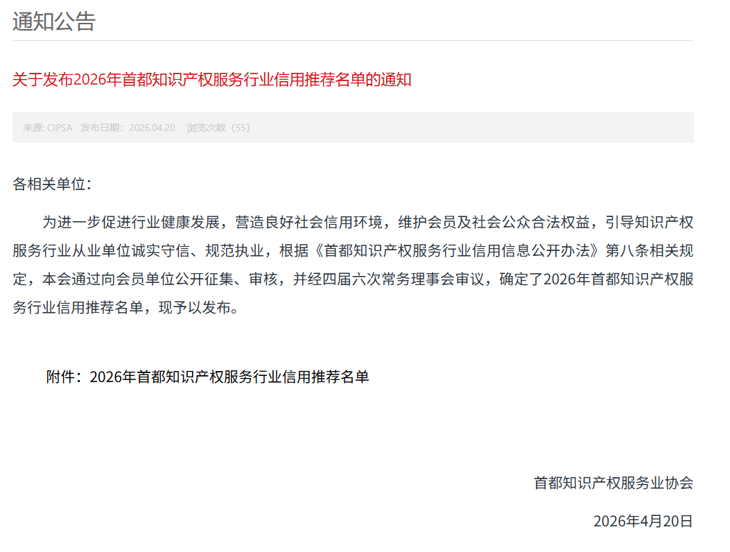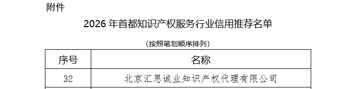 为进一步促进行业健康发展,培养良好社会信用环境,维护会员及社会公众合法权益,引导知识产权服务行业从业单位诚实守信,规范执业,根据《首都知识产权服务行业信用信息公开办法》第八条的相关规定,首都知识产权服务业协会通过向会员单位公开征集、审核,经本会四届六次常务理事会审议,通过了2026年首都知识产权服务行业信用推荐名单。汇思诚业秉承“务实诚信、精业守道”的企业精神,在多维度严格评选中脱颖而出,连续五年成功入选该榜单。这不仅是对我们长期坚持诚信经营、规范执业的充分认可,更是对我们始终以专业与责任为客户提供优质服务的有力见证。